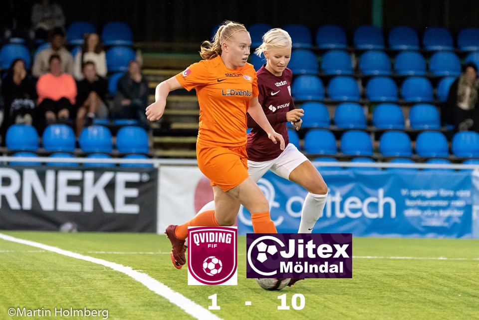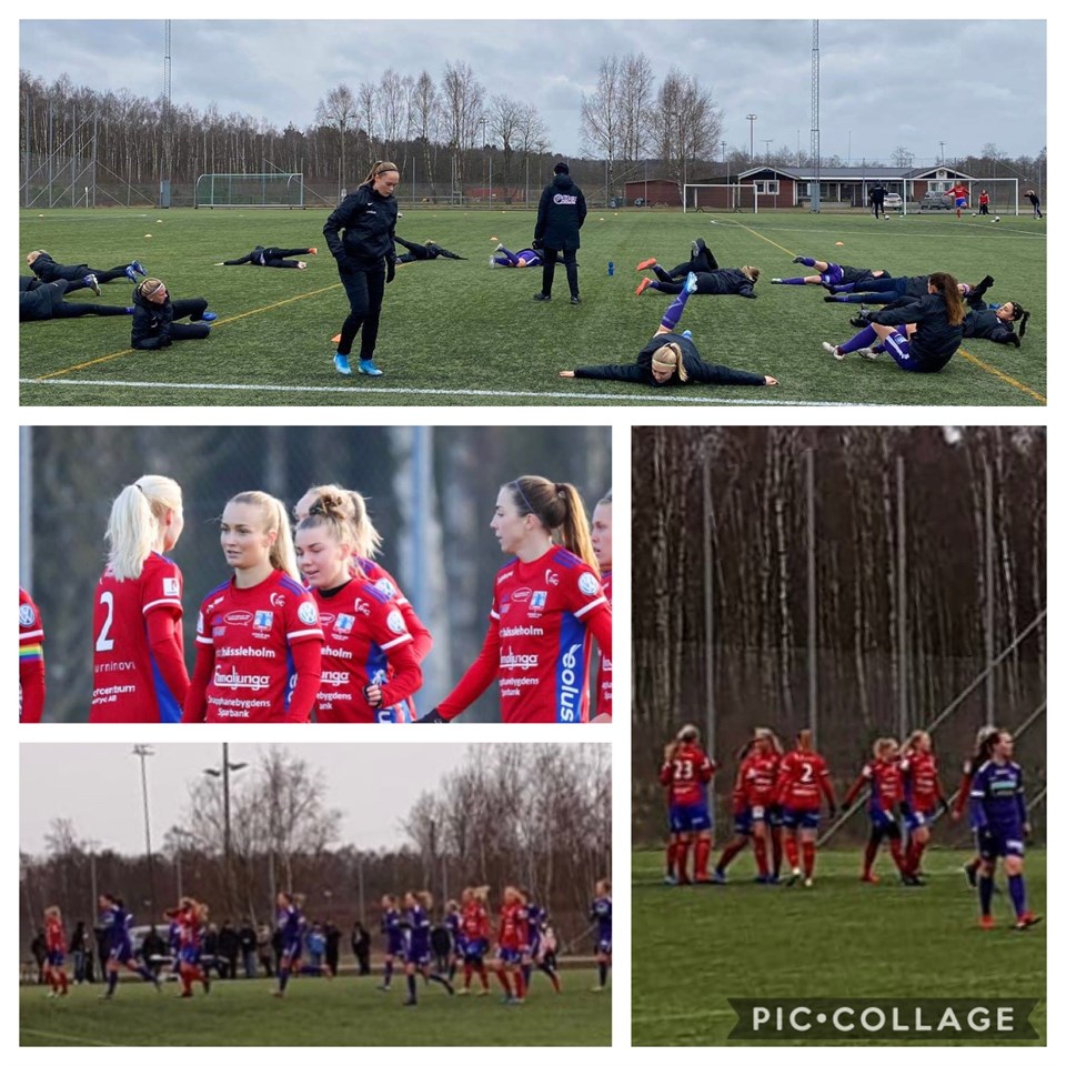 Idag stod Qviding för motståndet i försäsongens tredje träningsmatch. Qviding som spelar i div 1 Norra Götaland, där man 2019 till slut hamnade på en 6e plats efter en stark vårsäsong där de länge hängde med i toppen på en andra plats. Senast vi spelade mot Qviding var i Svenska Cupens andra omgång i augusti och där gick Jitex segrande från matchen med 2-0. Regnet hade i stort sett slutat innan matchstart men en fjärdedel av planen på Valhalla var fortfarande ganska vattensjuk, dock inte värre än att det gick att spela matchen. Vinden hade dock inte lugnat ner sig men verkade inte påverka spelet nämnvärt nere på planen. Laget som startade idag var Anna L, Felicia S, Emelie, Emma, Nora, Ella SY, Tindra, Ella R, Stinalisa, Mona samt Linnea och redo att hoppa in var Hannah, Anna F, Matilda, Fanny och Ida. Jitex kopplar ett rejält grepp om matchen från start och Qviding får inrikta sig på försvarsspel. Redan i den nionde minuten drar vi upp ett anfall på högerkanten som följs av ett inlägg som hemmamålvakten räddar men Tindra är framme och trycker in 0-1. Sedan faller målen med jämna mellanrum i första halvleken. 0-2 i 12e min genom Linnea som fångar upp en lång crossboll och rundar målvakten och kan sedan sätta bollen i mål, 0-3 i 16e min genom Stinalisa efter hörna när bollen till slut landar precis framför fötterna på henne framför målet samt 0-4 i 22a min som nästan är en kopia på första målet där Ella R trycker in bollen efter en retur på ett inlägg. I 27e min sticker Qviding med en brytning på mittplanen och kommer i sitt första riktiga anfall med några skott på mål som Anna räddar men vi inte lyckas få bort bollen riktigt och till slut kan Qviding reducera till 1-4. Tjejerna stoppas dock inte av detta utan i 34e min rullar vi upp ett anfall på vänsterkanten där LInnea kan hitta Stinalisa framför målet som enkelt placerar in 1-5. 1-5 är också halvtidsresultatet och Emma och Ella SY lämnar i halvlek och ersätts av Matilda och Fanny, medan Ida redan innan pausen kommit in istället för Mona som fick en skadekänning. I den andra halvleken fortsätter Jitex-övertaget - 1-6 genom Linnea i 55e min, 1-7 genom Nora i 64e min, 1-8 genom Stinalisa i 76e min, 1-9 av Linnea i 77e min samt slutresultatet 1-10 genom Ida i 90e minuten. Det blir stora siffror till slut och Jitex har ett stort spelövertag genom hela matchen som det också skall vara när det skiljer en division lagen emellan. Idag får vi träna på anfallsspelet under match som var tanken innan samt att hålla ett högt passningstempo. Kajsa kommenterar efter matchen: "I det stora hela fortsätter vi i högt tempo under hela matchen och fyller på i boxen precis som vi pratat om innan. Nora får flytta ner i banan och gör en jättebra match som ytterback och Felicia S får debutera som startspelare på andra ytterbacken och gör en väldigt bra match över 90 minuter." Nästa helg åker A-truppen på träningsläger och därefter väntar IF Böljan på hemmaplan på onsdagskvällen den 26/2 på Åbyvallen. Vi ses väl då?