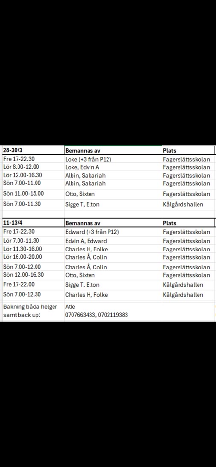Hej Alla! Nedan ser ni fördelning av passen för våra insatser på Fair Play Cup. Vi är två föräldrar från vårt lag och två från P12. Ni kommer få mer info om vad varje person ska bidra med, kiosk, sek. och hallansvarig. Ni kommer också att bli inbjudna till ett infomöte via teams från Smålands innebandyförbund. Alla ansvarar själva för byten och back up plan om ni får förhinder. Se till att ni har uppdaterade telefonnummer i Laget så att det blir smidigt att byta med varandra för er som behöver. Meddela ev. byten till mig (Elin 0707-663433). Vi har inte tagit med tränarna i schemat eftersom de lägger mycket tid ändå på våra barn under säsongen. Önskar er en fin söndag! Med vänlig hälsning, Elin och Niklas Isfall