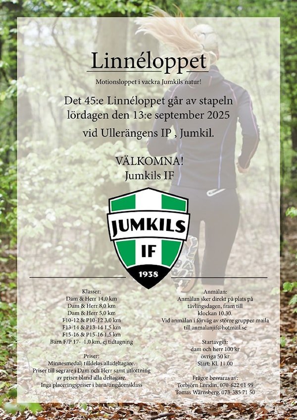 Välkomna till årets Linnélopp lördag 13 september - det 45:e loppet vid Ullerängen och skogarna runtomkring. Löpningen sker på elljuspår, grusväg och härliga terrängstigar.