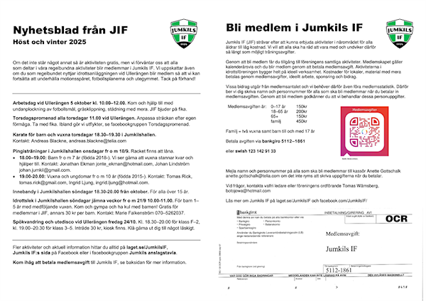 De aktiviteter som JIF arrangerar är gratis om det inte står något annat, men vi förväntar oss att alla som deltar i våra regelbundna aktiviteter blir medlemmar i Jumkils IF. Vi uppskattar även om du som regelbundet nyttjar idrottsanläggningen vid Ullerängen blir medlem så att vi kan fortsätta att underhålla motionsspåret, fotbollsplanerna och utegymmet. Som medlem stöttar du den breda verksamhet som föreningen erbjuder för alla åldrar. Tack på förhand!