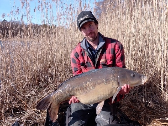 Daniel gjorde karppremiär under dagen, jag låter han berätta själv "Såg på prognosen att det skulle blåsa nordligt, så beslutade mig för ett pass i lämplig vik. Beten på plats kl 8,30, ungefär en å en halv timme senare drar det på betet som ligger längst in i viken, en nuttycrunch popup. Fisken kämpar bra med tanke på den låga vattentempen, men går i håven utan problem, 90 cm å 13330 gram." Stort grattis och bra jobbat