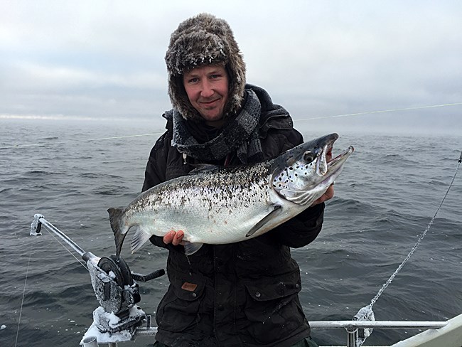 Jonatan trottsade kylan på trettondagen och var tillsamans med Anders Bladh ute på trolling på Vänern, Fisken nappade och Jonatan tog den största för dagen , en riktigt fin Vänerlax på 7,75kg Skitfiske Jon Bergström