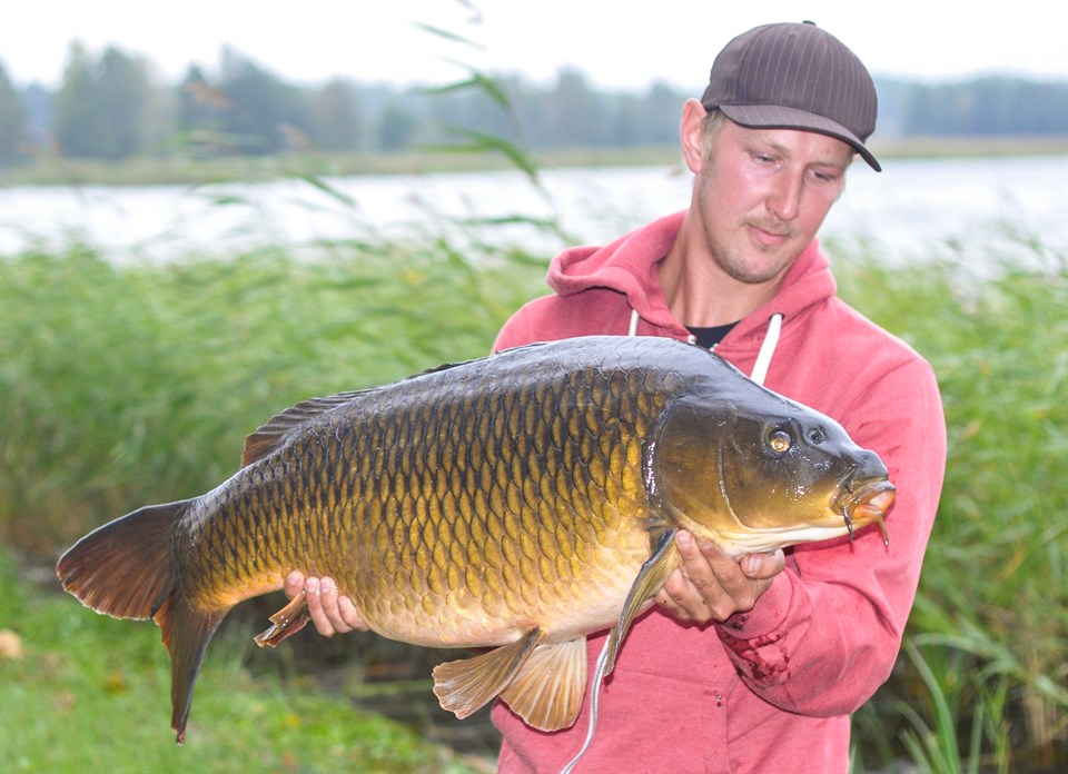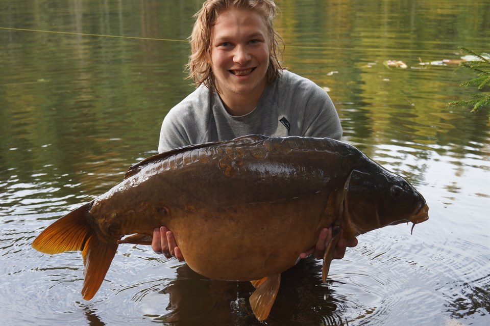 Under veckan har Isak Nilsson och Ludvig Karlsson fiskat i dammen, första natten blev stilla som den oftast brukar vara för fiskarna i dammen. Med under torsdags morgonen blir det ett take på moster crab betet som Ludvig fiskade med. En lycklig fångstman kunde efter håvning konstatera att det var Tjockisen som hade behagat plocka upp boiliesen och den vägdes till 17,56 kg fördelat på 89cm. En riktigt glad Ludvig syns på bilden, stort grattis till andra karpen i livet! SG Karpkraft Jon Bergström