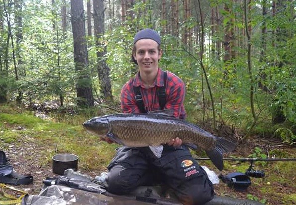 Efter en tids avsaknad av karpfiske bestämde jag mig för att testa en natt i våran egen damm (istället för att man åker land och rike runt). Jag bestämde mig för att jag skulle fiska natt till måndag denna vecka när det skulle bli ett ordentligt väderomslag från soligt och varmt till skyfall. Riggade ut sakerna under söndag kväll och kröp in i tältet i skydd för myggen och väntade med spänning, det blev en sömnrik natt utan minsta pill på beten. Men regn kom det på måndag morgon så det stod som spön i baken. Lite besviken att det inte hände något under natten bestämde jag mig vid lunchtid att jag fiskar en natt till, lagret fick stå kvar under dagen för att torka upp lite efter morgonen väder. Tillbaka till dammen var jag strax efter 17.00 och började rigga ut betena, blåsten var besvärlig så jag var inte färdig med allt förrän närmare kl 20. Pockade ihop alla saker som jag spritt på landbacken för att sedan krypa in i tälten, redan kl 22.50 skriker mitt vänstra larm som jag lagt ut i lagunen. Pulsen stiger och nar jag greppar spöt känner jag motstånd och att fisken kommer med ut från växligheten, fighten var odramatisk till en början men när den närmar sig landningsplatsen gör den några våldsamma utfall. Allting går bra och fisken glider in i håvnätet. Jag kolla ner i håven och ser direkt att det är tjockisen som tagit min snögubbe, jag ringer direkt min sambo för hjälp med foto. När väl det är gjort säckar jag karpen som är riktigt tung. När hjälp kommer väger jag fisken till 17,9kg längden är 89cm och omkretsen är 82cm. Skattande konstaterar jag att jag slagit PB med drygt 4 kilo och det är inte varje dag! Fler bilder finns under fliken stora fiskar 2015 i foto albumet. Skitfiske Jon Bergström