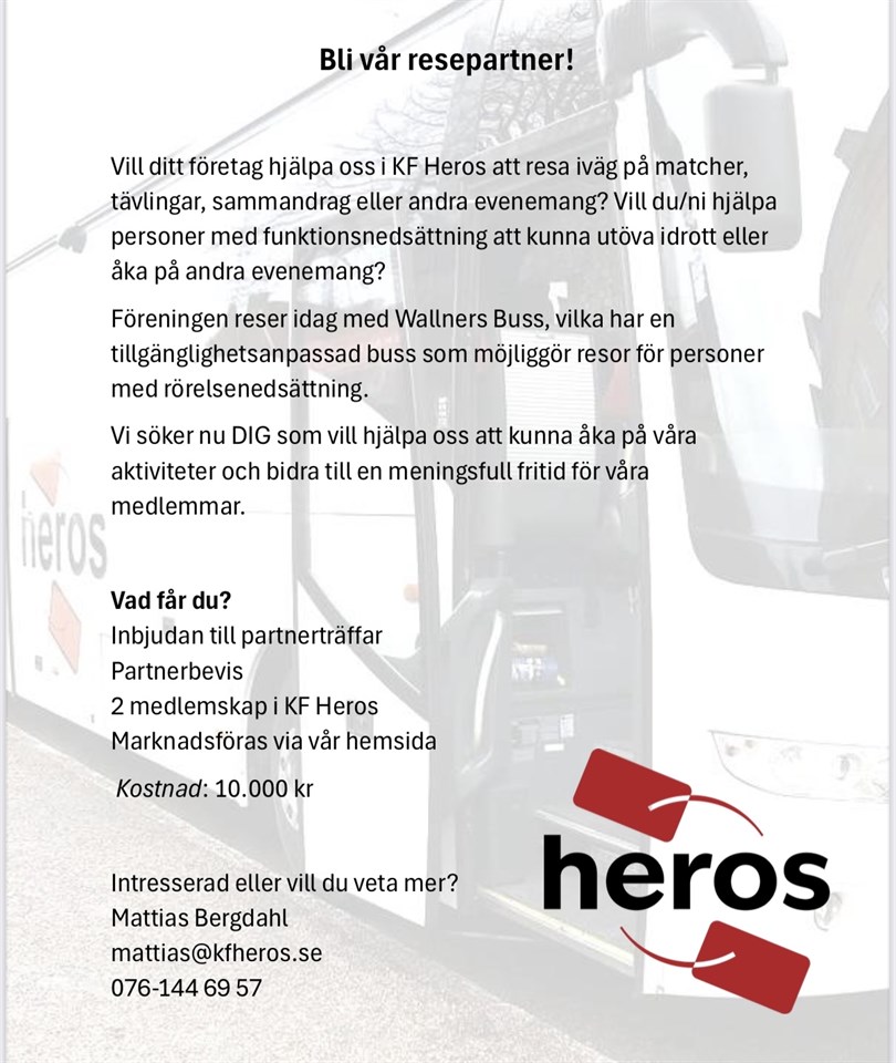 Vi reser idag med Wallners Buss, som erbjuder tillgänglighetsanpassade bussar som bland annat kan vara ett måste för personer med en rörelsenedsättning. Men för att kunna fortsätta erbjuda våra medlemmar en meningsfull fritid behöver vi fler partners som vill stötta vår resa.