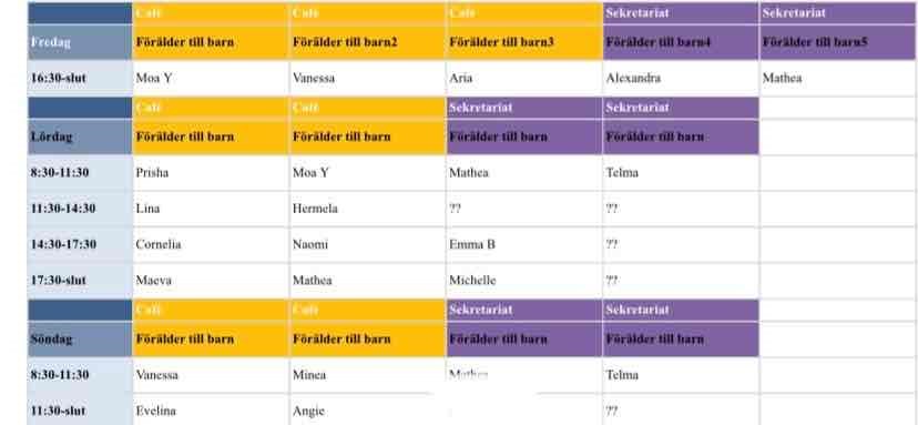 Ni alla ska ha fått schemat via Mail. Har jag missta någon så ber jag om ursäkt! Får skylla på att jag var trött 😴 Jag har också publicerat det i F11:s grupp på Facebook. Som ni ser så saknar vi täckning för några pass. Om alla som har tid över i helgen kommer till Beckombergahallen så kommer allt att lösa sig och tjejerna kommer också få en ordentlig klack ?🏀 Låt oss sluta upp så kommer Blackeberg basketcup i Beckombergahallen att gå till historien! Basket är kul! F11 Vit 2 sep 2025 0kommentarer