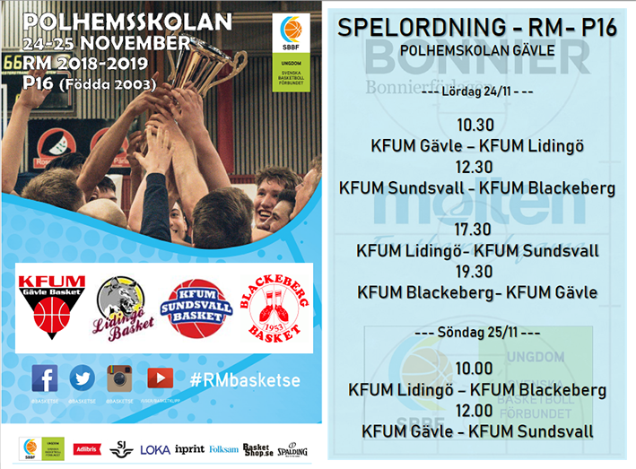 Nu i helgen arrangerar KFUM Gävle Basket, för första gången en omgång i RM (Riks Mästerskapet). Det är P16-lag från Sundsvall, Lidingö, Blackeberg och naturligtvis KFUM Gävle som kommer att delta. Kom och titta när våra grabbar tar sig an några av de bästa lagen i Sverige. Alltså, RM, P16, 24-25 nov i Polhemsskolan, ingen entré. KFUM Gävle Basket 22 nov 2018 0kommentarer