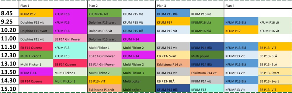 Hej, Vi har första matchen redan kl.11:00 mot Norrköping Dolphins F-15. Det gör att vi behöver samlas 10:30 för att tjejerna ska hinna byta om innan matchstart. Följande matcher är sedan; 12:30 EB F14 Gril Power - KFUM F14 13:50 Multi F14 - KFUM F14 Vi tar över kiosk, matchvärd, seketariat etc från 12:00. Inhandling och uppsättning av kiosk hanterar jag och Robert (Vanjas pappa) denna gång men vi behöver hjälpas åt att bemanna kiosken under eftermiddagen. Övrigt ansvar är som enligt tidigare kommunicerat enligt nedan: Sekretariat Stella L och Alice (ni har även möjlighet att spela musik i högtalare mellan matcher etc) Matchvärd Ebba samt Maria Plocka undan efter match Sara samt Amira Jag och Moa kommer att finnas på plats från förmiddag. Gör gärna tumme upp nedan eller skriv ok så jag vet att ni tagit del av den nya startiden av match. Ses på söndag! /Louise