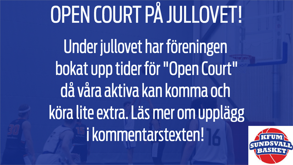 Under jullovet har föreningen bokat upp tider för de som vill köra lite extra på dagarna. Open Court är inga organiserade träningar utan här bestämmer de som är på plats om de vill träna på att skjuta, dribbla eller kanske spela match. Följande dagar är bokade: 27-29/12 2-5/1 Det är två pass per dag uppbokade: 10.00-11.30 11.30-13.00 Plats: Baldershallen 5 Det tidiga passet är för barn 11-15 år och det sena passet för 16-uppåt. Ledare bestående av spelare från våra äldre lag kommer finnas på plats på det tidiga passet. Mvh Styrelsen