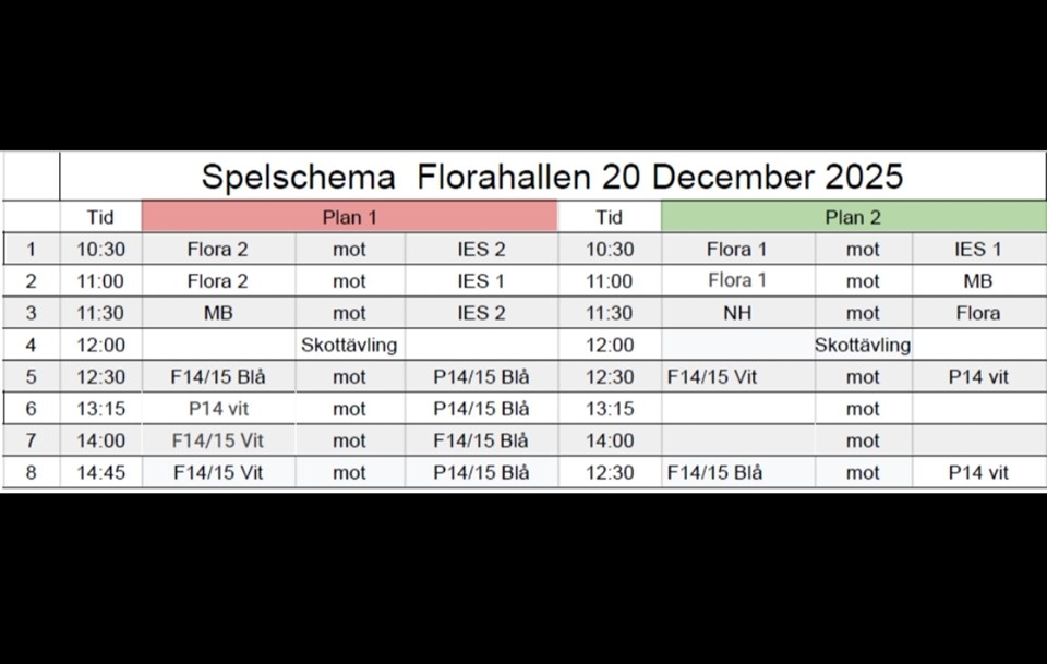 Vi samlas i Florahallen 30 min före första match, kl. 10.00. Vi har delat in truppen i två lag så att alla ska få mer speltid. Ni kan se på spelschemat hur upplägget är för dagen. Barnen kommer få information om vilket lag de tillhör på samlingen.