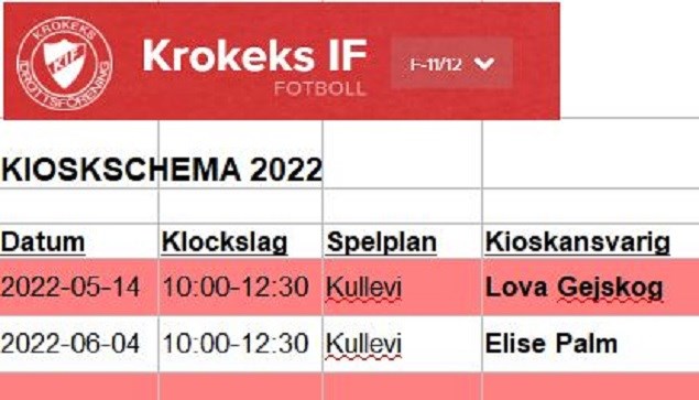 Nu är kioskschemat uppdaterat med höstens tider, OBS första tid är redan imorgon 13/8. Länk till nerladdning: https://www.laget.se/KIF11-12/Document/Download/0/9970987 Som vanligt så gäller byt med varandra om tilldelad dag ej passar.