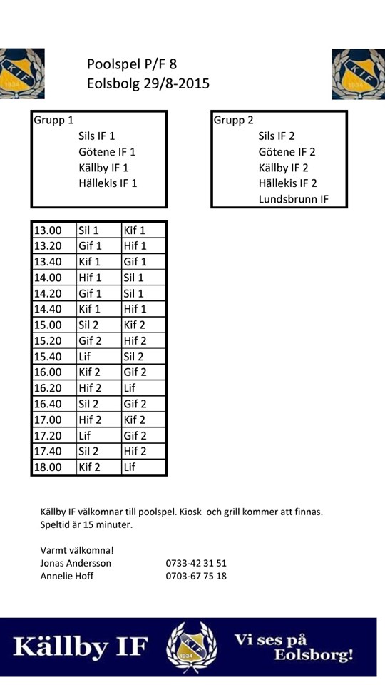 Grill 12.45-14 Albin S 14-15 Ossian L 15-16 Ossian H 16-17 Lucas o felix 17-18 Marshall Kiosk 12.45-14 Nova S Kalle o Gustav 14-15 Noah o iris 15-16.30 August o neo 16,30-18 Hanna o Elina Bakning av någon slags mjuk kaka: Alfred T Mattis Travis Nelly Erik B Liam Ossian H. Om någon annan vill baka så är det välkommet. Kan ni inte dessa tider så får ni byta med varann. Hoppas på en rolig dag. Vid frågar ring Annelie 0703677518 Jonas 0733423151 P07 25 aug 2015 0kommentarer