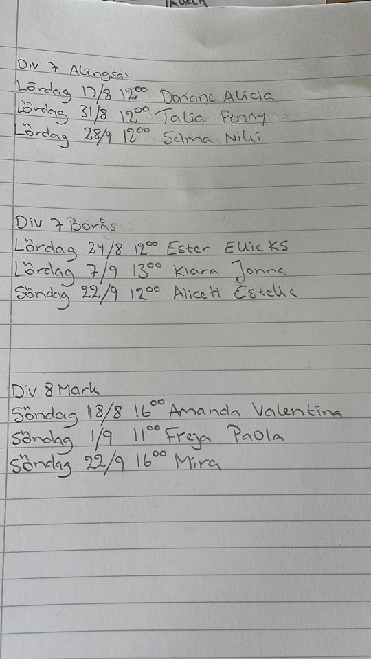 Hej! Hoppas ni alla har haft en härlig sommar och är laddade för ny säsong med fotbollen 😊. Vi lagföräldrar har satt ihop en kiosklista för höstens matcher på Viskavallen. Den här omgången är uppdelad i tre grupper div 7 Alingsås, div 7 Borås och div 8 Mark. Är det så att man inte kan stå när man är tilldelad så byter man inom sin grupp. Gå gärna in och läs i dokumentet kring hur arbetet kring kiosken fungerar- dokumentet finns på laget sidan. Mvh Lagföräldrar F-13 (2013) 5 aug 2024 0kommentarer