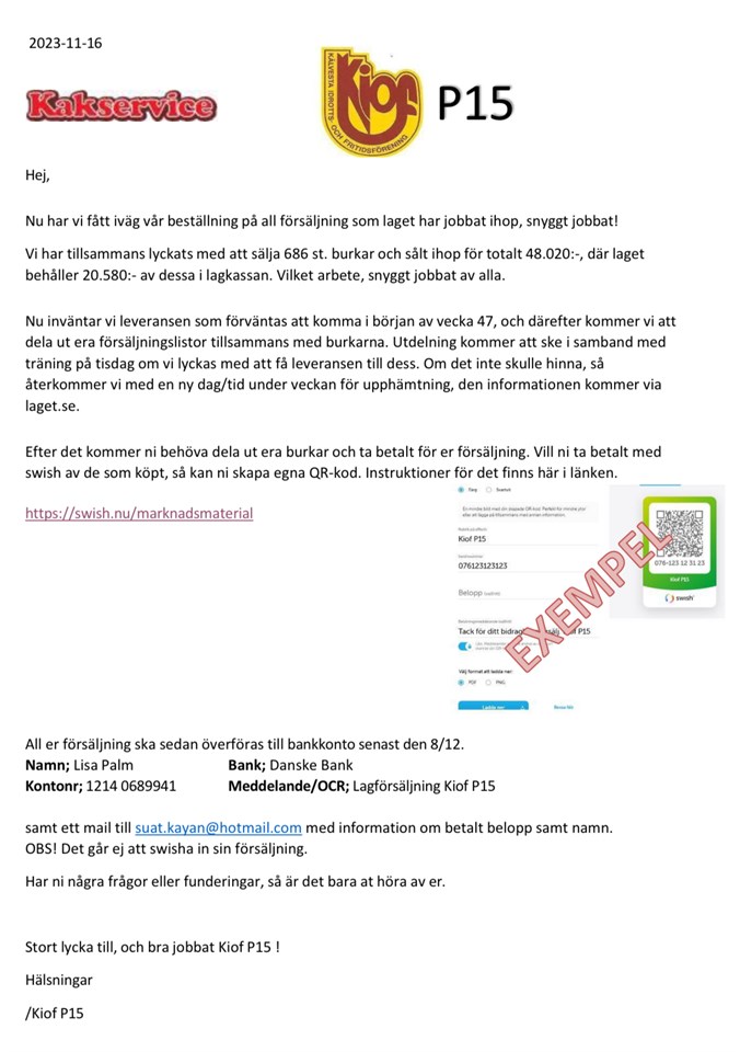 Hej, Nu har vi fått iväg vår beställning på all försäljning som laget har jobbat ihop, snyggt jobbat! Vi har tillsammans lyckats med att sälja 686 st. burkar och sålt ihop för totalt 48.020:-, där laget behåller 20.580:- av dessa i lagkassan. Vilket arbete, snyggt jobbat av alla. Nu inväntar vi leveransen som förväntas att komma i början av vecka 47, och därefter kommer vi att dela ut era försäljningslistor tillsammans med burkarna. Utdelning kommer att ske i samband med träning på tisdag om vi lyckas med att få leveransen till dess. Om det inte skulle hinna, så återkommer vi med en ny dag/tid under veckan för upphämtning, den informationen kommer via laget.se. Efter det kommer ni behöva dela ut era burkar och ta betalt för er försäljning. Vill ni ta betalt med swish av de som köpt, så kan ni skapa egna QR-kod. Instruktioner för det finns här i länken. https://swish.nu/marknadsmaterial All er försäljning ska sedan överföras till bankkonto senast den 8/12. Namn; Lisa Palm Bank; Danske Bank Kontonr; 1214 0689941 Meddelande/OCR; Lagförsäljning Kiof P15 samt ett mail till suat.kayan@hotmail.com med information om betalt belopp samt namn. OBS! Det går ej att swisha in sin försäljning. Har ni några frågor eller funderingar, så är det bara at höra av er. Stort lycka till, och bra jobbat Kiof P15 ! Hälsningar /Kiof P15