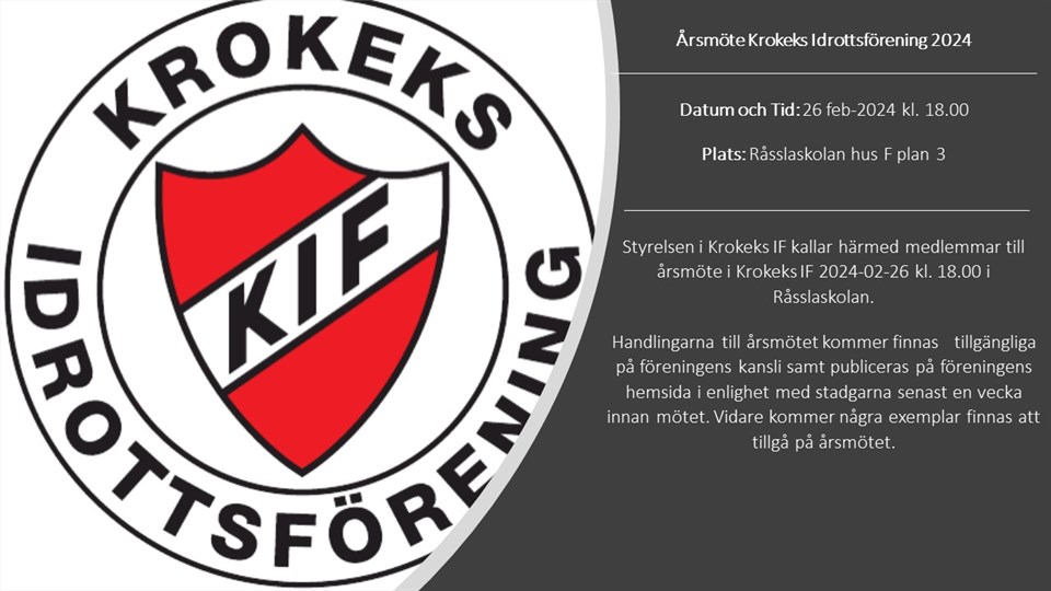Årsmöte Krokeks Idrottsförening 2024 __________________________________________________________ Datum och Tid: 26 feb-2024 kl. 18.00 Plats: Råsslaskolan hus F plan 3 ___________________________________________________________________________ Styrelsen i Krokeks IF kallar härmed medlemmar till årsmöte i Krokeks IF 2024-02-26 kl. 18.00 i Råsslaskolan. Handlingarna till årsmötet kommer finnas tillgängliga på föreningens kansli samt publiceras på föreningens hemsida i enlighet med stadgarna senast en vecka innan mötet. Vidare kommer några exemplar finnas att tillgå på årsmötet. Dagordning 1. Mötets öppnande 2. Fastställande av röstlängd för mötet 3. Fråga om mötet har utlyst på rätt sätt 4. Fastställande av dagordning 5. Val av ordförande och sekreterare för mötet 6. Val av protokolljusterare och rösträknare för mötet 7. Föredragning av verksamhetsberättelse och förvaltningsberättelse a) Styrelsens verksamhetsberättelse för det senaste verksamhetsåret b) Styrelsens förvaltningsberättelse (balans och resultaträkning) för det senaste räkenskapsåret 8. Revisorns berättelse om styrelsens förvaltning under det senaste verksamhets- och räkenskapsåret 9. Fråga om ansvarsfrihet för styrelsen den tid revisionen gäller 10. Fastställande av medlemsavgifter 11. Fastställande av verksamhetsplan och behandling av budget för det kommande verksamhets/räkenskapsåret 12. Val av: a) Ordförande för en tid av 1 eller 2 år b) Ordinarie ledamöter för en tid av minst ett år och högst två år c) Minst en och högst 3 suppleanter för en tid av ett år d) En revisor och suppleant för denna för en tid av ett år. Ordinarie styrelseledamöter får ej välja revisor e) Minst en ledamot i valberedningen för en tid av ett år. Välj mer än en skall den ena av dessa utses som sammankallande f) Ett ombud till möten där föreningen har rätt att vara representerad genom ombud 13. Behandling av styrelsens förslag och i rätt tid ankomna motioner 14. Övriga frågor a) Årets KIF:are b) Avtackningar 15. Mötet avslutas Krokeks IF 1 feb 2024 0kommentarer
