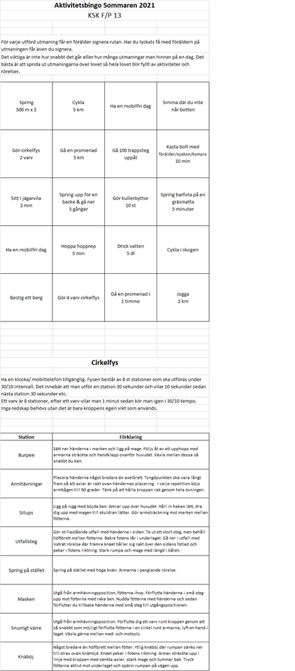 Hej! Vi i KSK F/P-13 har nu tagit sommaruppehåll. Efter sommaren startar vi upp igen som två separata lag - ett pojklag och ett flicklag. Både gamla och nya spelare är då välkomna! Information om när vi startar upp igen kommer längre fram. På vår avslutning delade vi ut ett aktivitetsbingo som barnen kan göra under sommaren, gärna tillsammans med en förälder. Bingot finns bifogat för er som missade sista träningen, eller om det kommit bort. Laget.se klarar bara av att publicera filer i vissa format och jag har försökt att få in bingot i ett sånt format. Hör av er om det inte funkar, så kan jag maila filen i excel, där det skapades ursprungligen. Trevlig sommar Tränare och ledare för KSK F/P-13