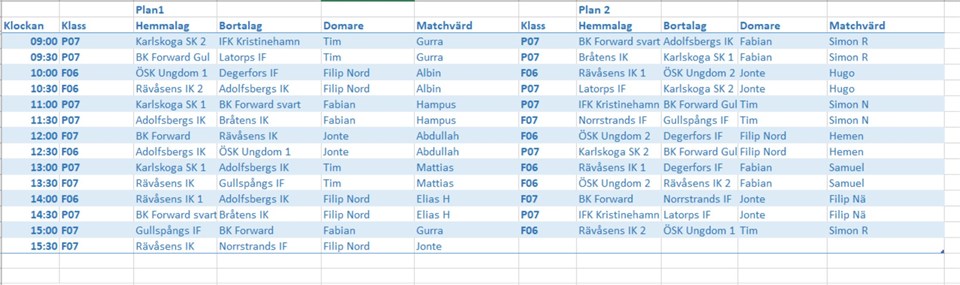 Påminner om bemanningen på Stråcupen. SAMLING VID STRÅ LÖRDAG KL 07:45! Alla tar med ca 20 bitar hembakat eller motsvarande. Följande tar med en fylld kaffetermos så att vi kan servera kaffe direkt på morgonen. Simon R Hugo Tim Albin Hampus Filip Nord Matcherna börjar kl 09:00 och pågår till 16:00. Alla anmälda killar har fått olika uppgifter under hela dagen och föräldrar bemannar kiosk och grill enligt schema. Kiosk: Föräldrar 08:30 Jonte Simon R 10:00 Elias H Filip N 11:30 Hampus Gurra 13:00 Abdullah Tim 14:30 Hugo Simon N 16:00 Alla (undanplockning/borttransport) Grill: Föräldrar 10:00 Filip Nä Simon R 11:30 Albin Hemen 13:00 Samuel Mattias 14:30 Simon R Elias H Speedshooting: (Bemannas av killarna själva): 10:00 Filip Nä Samuel 11:00 Elias H Hemen 12:00 Hugo Gurra 13:00 Albin Simon R 14:00 Abdullah Hampus Utöver dessa scheman ska våra killar döma och vara matchvärdar enligt bifogad bild. Matchvärden ser till att matcherna kommer igång på utsatt tid, hjälper lagen och domarna samt utser matchens kämpe i båda lagen tillsammans med domaren. Vid frågor eller funderingar kontaktar ni CUP-gruppen på stracupen@karlskogask.se Eva R, Malin S, Erica H, Susanne S, Linda N P-03 20 apr 2017 0kommentarer
