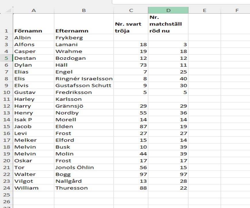 Just nu inventerar jag röda matchställ, så dessa nummer kan förändras om tex storleken behöver byttas eller vid dubbla nummer, som det ser ut just nu behöver vi inte bytta något nummer på dem svarta tröjor. Det saknas uppgifter hos 2 spelare, så skriv gärna i komentarsraden i vilka nummer de spelar.