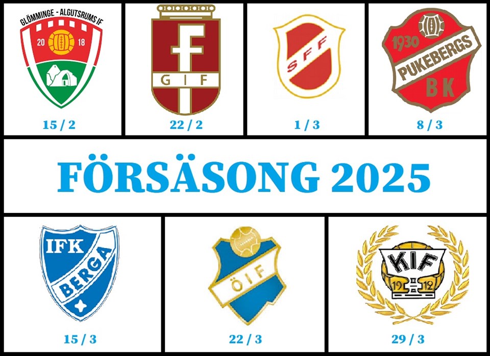 Försäsongen inför säsongen 2025 är spikad och är bokade enligt följande: Lördag 15:e februari: Glömminge-Algutsrums IF (4) - borta Lördag 22:e februari: Färjestadens GOIF (4) - borta Lördag 1:e mars: Sävsjö FF (4) - hemma Lördag 8:e mars: Pukebergs BK (3) - borta Lördag 15:e mars: IFK Berga (3) - hemma Lördag 22:e mars: Östers IF P19 (P19 Superettan) - borta Lördag 29:e mars: Kosta IF (4) - borta OBS! Detta är en presentation av det bokade träningsmatchena! Då vissa matcher ännu saknar avsparkstid och spelplats, kommer mer info att skrivas ut längre fram!