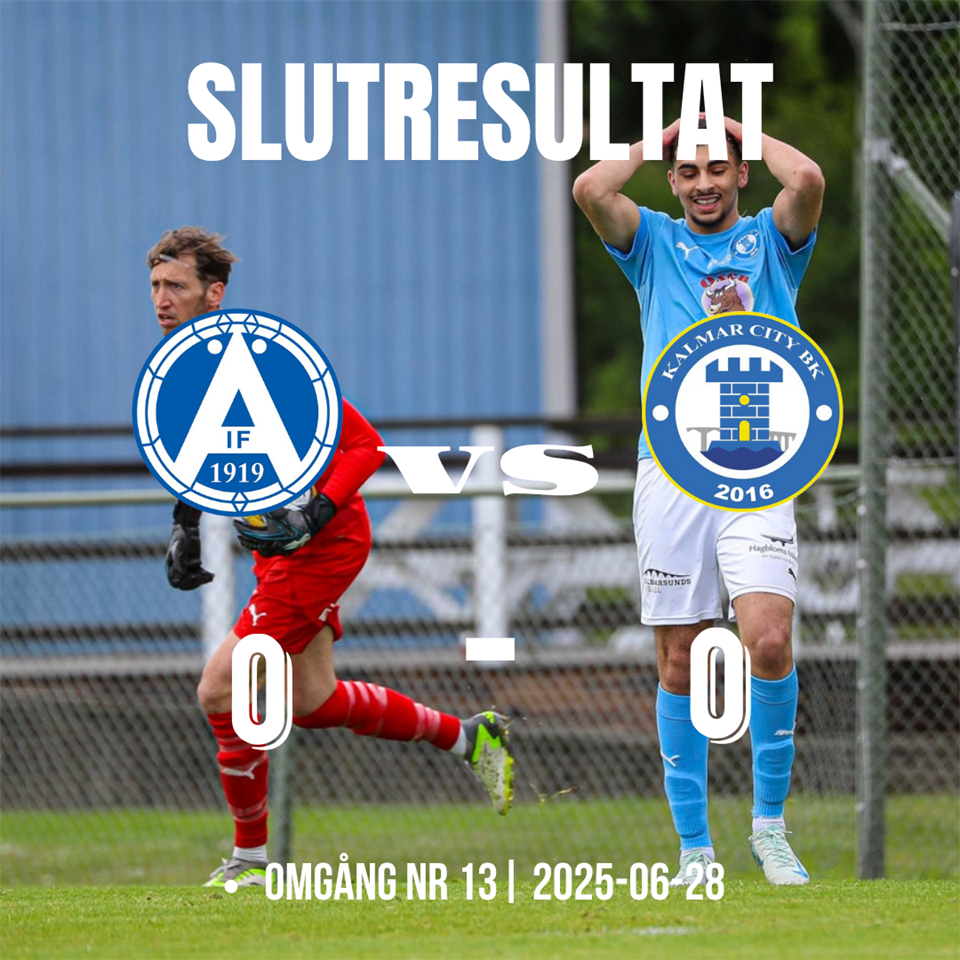 Älmhults IF - Kalmar City BK 0-0- (0-0) Division 3 Sydöstra Götaland - Omgång 13 Matchens lirare Kevin Makin Gula kort Theo Ingard, Karzan Eliassi Kommentar ifrån huvudtränaren Ardi: " Det var en svår match på förhand, men trots att vi inte presterade på toppnivå dominerade vi från början och skapade många chanser i båda halvlekarna. Det är med besvikelse och en bitter eftersmak som vi konstaterar att vi inte utnyttjade våra chanser. Den enda skillnaden nu mot Älmhults IF är att vi inte var effektiva framför mål, till skillnad från hemmamatchen. Nu har vi en cupmatch kvar där vi ska försöka avsluta snyggt innan semestern " .