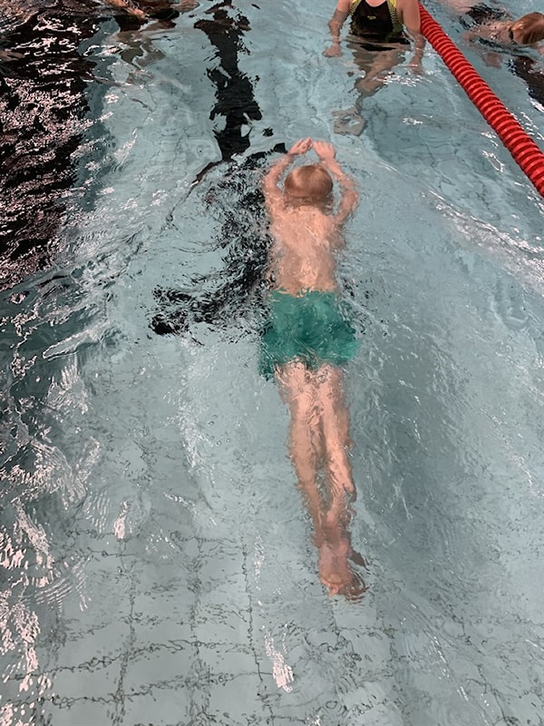 Vi övar benspark, ryggsim och glid och börjar känna lite på bröstsim.
