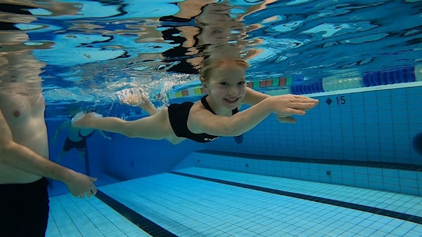 Vi övar benspark, ryggsim och glid och börjar känna lite på bröstsim.