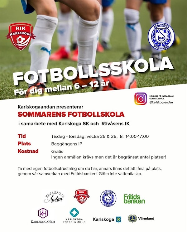 På tisdag drar Karlskogaandans kostnadsfria fotbollskola igång på Baggängen för barn i åldern 6-12 år. Välkomna!