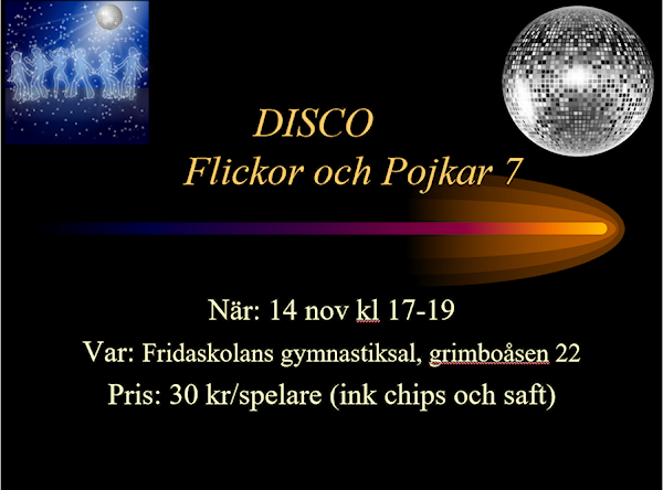 Vi har planerat ett disco för laget tillsammans med P7. Vi har bokat fridaskolans gymnastiksal och tänker oss ett aktivt disco med hinderbana och andra roliga aktiviteter tillsammans :)