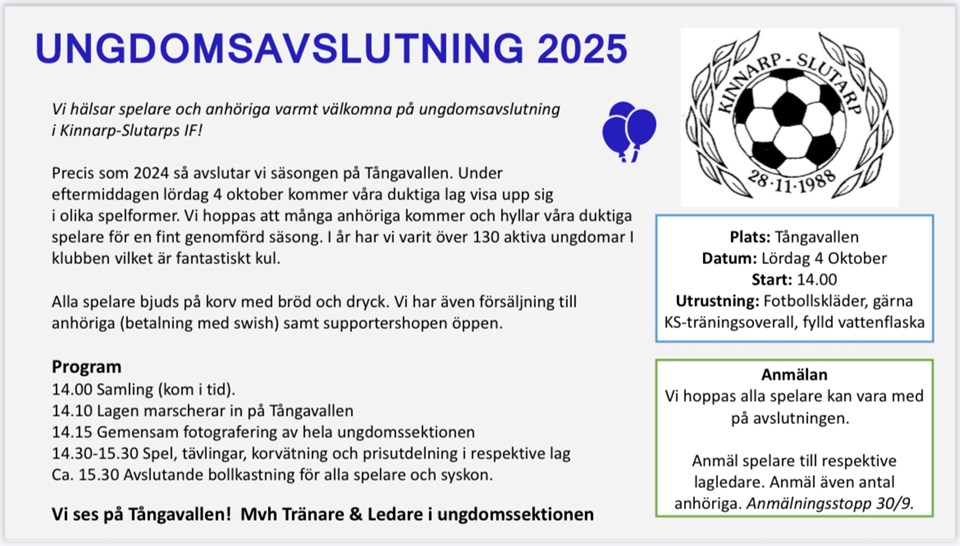OBS! Pga stormvarning flyttas avslutningen på lördag inomhus till Kinnarpshallen. Samma tid kl 14.00. Ta med inomhusskor, ombytta i träningskläder. Gärna blå Kinnarpströja.