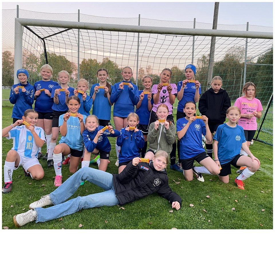 Ikväll var det sista utomhusträningen för säsongen. Det blev en lite annorlunda träning. Vi startade med en uppvärmnings dans , sen blev det lite små matcher medans vi ledare fixade i ordning en stafett. I stafetten var dom indelade i 4 lag , man startade med lite slalom , sen skulle man ta med sig en boll o driva några meter innan man gjorde ett skott på mål , missade man så blev det en kort straffrunda men satte man skottet så sprang man direkt till sitt lag o skickade i väg nästa . Detta tyckte tjejerna var väldigt roligt :) Träning avslutades med att tjejerna skulle skjuta mål på våran alldeles egna super målvakt Jennica. Dom skulle skjuta sammanlagt 8 mål så skulle dom få en överraskning, efter första omgången så hade dom satt 6 skott av 19 . Men i andra omgången så blev det stor vinst till tjejerna, dom satte 12 skott av 19 så givetvis så fick dom en lite överraskning av oss . En kexchoklad. Super bra jobbat av alla . / ledarna