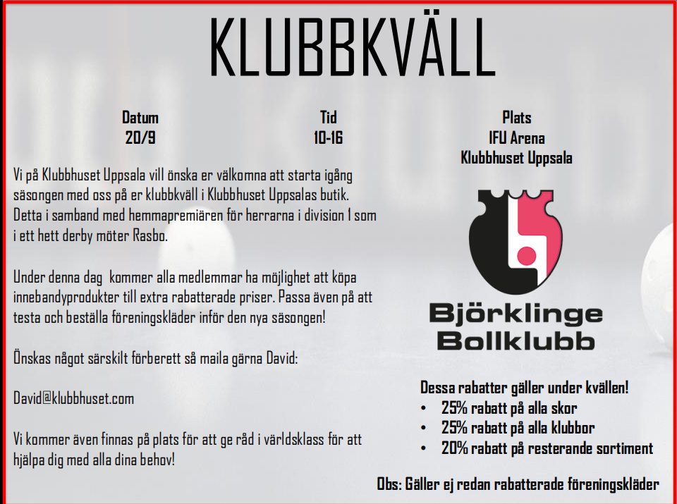 Den 20/9, i samband med säsongspremiären och även derby, för herrarna i H1an kör vi föreningsdag på Klubbhuset. Sprid detta till era lag.Finfina priser hos KH, perfekt inför säsongsstart! Vore även kul om man kommer och hejar såklart! Alla som bär BBK-kläder kommer in gratis!