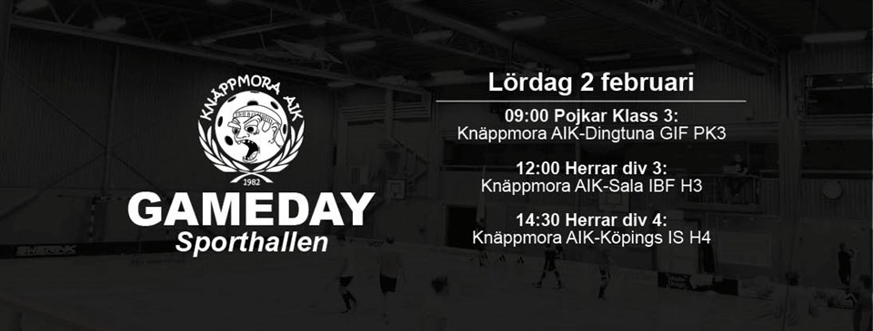 Gameday i Sporthallen 2 Februari 10:30 Pantamera pojkar klass 3 Knäppmora AIK vs. Dingtuna GIF 12:00 Herrar div 3 Knäppmora AIK vs. Sala IBF 14:30 Herrar div 4 Knäppmora AIK vs. Köpings IS Varmt välkomna!