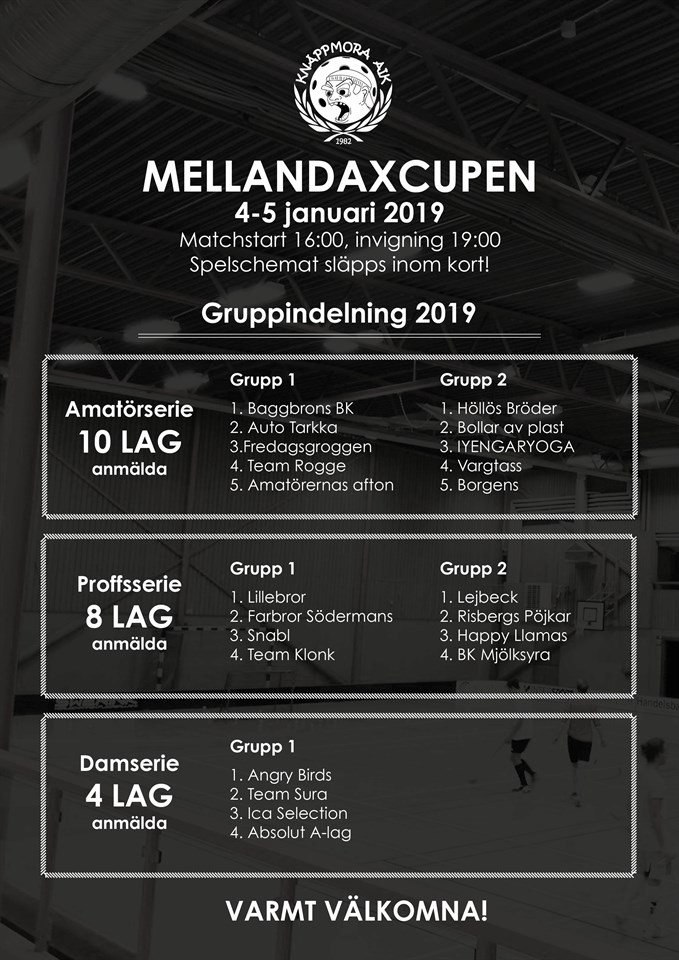 Mellandaxcupen 2019 4-5 januari matchstart 16:00 invigning 19:00 Amatör Grupp 1 1. Baggbrons BK 2. Auto Tarkka 3.Fredagsgroggen 4. Team Rogge 5. Amatörernas afton Grupp 2 1. Höllös Bröder 2. Bollar av plast 3. IYENGARYOGA 4. Vargtass 5. Borgens Proffs Grupp 1 1. Lillebror 2. Farbror Södermans 3. Snabl 4. Team Klonk Grupp 2 1. Lejbeck 2. Risbergs Pöjkar 3. Happy Llamas 4. BK Mjölksyra Dam Grupp 1 1. Angry Birds 2. Team Sura 3. Ica Selection 4. Absolut A-lag Knäppmora AIK 24 dec 2018 0kommentarer