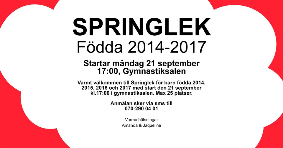 SPRINGLEK Födda 2014-2017 Startar måndag 21 september 17:00, Gymnastiksalen Varmt välkommen till Springlek för barn födda 2014, 2015, 2016 och 2017 med start den 21 september kl.17:00 i gymnastiksalen. Max 25 platser. Anmälan sker via sms till 070-290 04 01 Varma hälsningar Amanda & Jaqueline