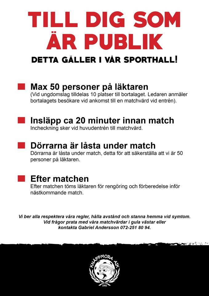 Vi är ledsna att vi inte kan ha fler än 50 personer på läktaren under gående pandemi men vi ber er respekta dessa regler! Vid frågor kontakta Gabriel Andersson 072-251 80 94 Max 50 personer på läktaren. (Vid ungdomslag tilldelas 10 platser till bortalaget. Ledaren anmäler bortalagets besökare vid ankomst till matchvärd). Insläpp ca 20 minuter innan match. Incheckning sker vid huvudentrén. Dörrarna är låsta under match, detta för att säkerställa att vi är 50 personer på läktaren. Efter matchen Efter matchen töms läktaren för rengöring och förberedelse inför nästkommande match. Vi ber alla respektera våra regler, hålla avstånd och stanna hemma vid symtom. Vid frågor prata med våra matchvärdar i gula västar eller kontakta Gabriel Andersson 072-251 80 94.
