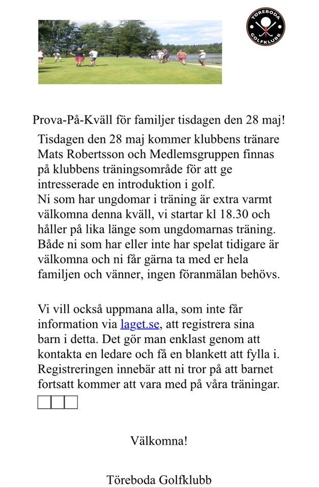 Medlemsgruppen bjuder in till prova på i samband med knatteträningen den 28:e maj. Se info Knattegolfen 19 maj 2019 1kommentar