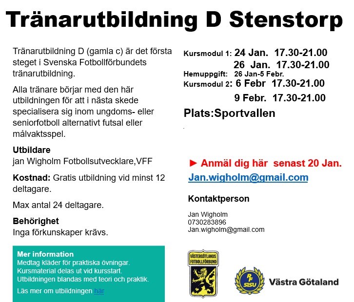 Nu finns det tillfälle att gå Tränarutbildning D, den första utbildningen man går av alla fotbollsutbildningar. Våmbs IF ser gärna att alla som är ledare går denna utbildning. Utbildningens första modul går av stapeln 24/1 eller 26/1 och modul 2 6/2 eller 9/2. Ni kan välja vilken dag ni vill gå. Anmäl er till jan.wigholm@gmail.com Knatteledare 17 jan 2023 0kommentarer