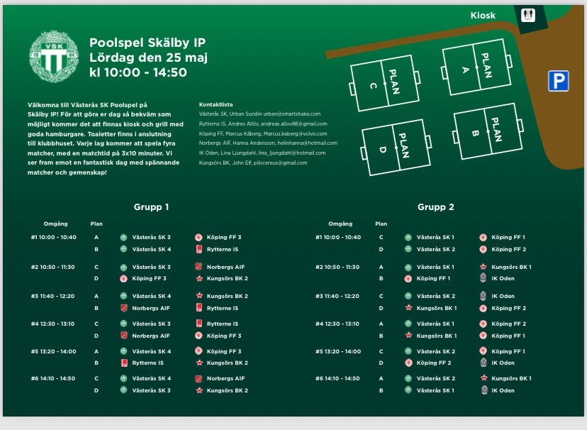 Hej Alla - Vi har blvit kallade till poolspel nästa lördag 25/5. Kallelse kommer inom kort. Vänligen svara på kallselsen, oavsett om ert barn kommer eller ej. Det underlättar för ledarna att planera. - Vi har anmält oss till fotbollens dag som är i augusti. Mer info om detta kommer. - Vi kommer ha poolspel i Köping v 36 och 38, där vi är matchvärdar. mer info kommer efter att föräldrargruppen har haft möte. Då vi inte har någon lagkassa i dagsläget och det måste inhandlas till poolspelet. Så undrar vi nu om det är någon i föräldrargruppen eller om ni känner någon som har eget företag och vill sponsra våra pojkar och poolspelen. Hör av er isåfall till Syzane eller Josefine L. MVH Ledarna och Föräldrargruppen.