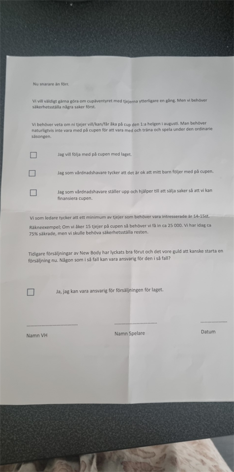 Påminner om att lämna in lappen om cup så fort som möjligt.