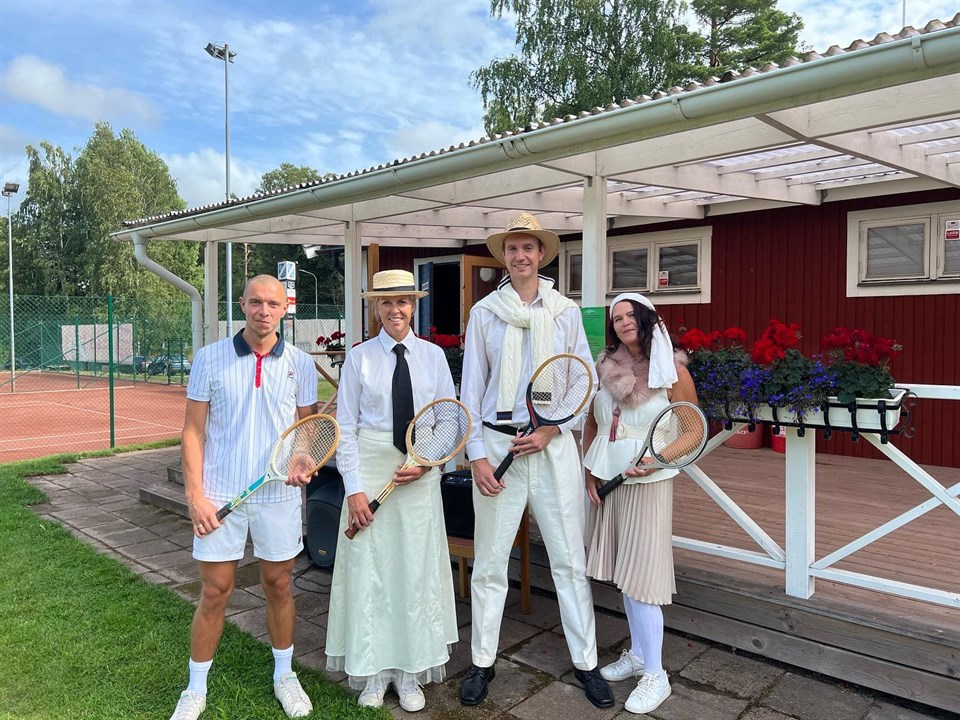 En pigg hundraåring! I helgen uppmärksammades att Kristinehamns TK i år firar hundra år som klubb. Jubileet samordnas med Tennisens dag vid stadion. Tillställningen var välbesökt och åskådarna bjöds på en sammanställning av KrTK:s historia, uppvisningsspel mellan Bruno och Per, femkamp, tipspromenad, prova på tennis och såklart korvgrillning och fika. Dessutom en dubbelmatch i kläder och racketar från olika tidsepoker. Vår vaktmästare och trotjänare Anders Skott och vår tidigare tränare Karin Johansson avtackades under eftermiddagen. Vädret bidrog även det till ett väldigt lyckat arrangemang! Kristinehamns Tennisklubb 21 aug 2022 1kommentar