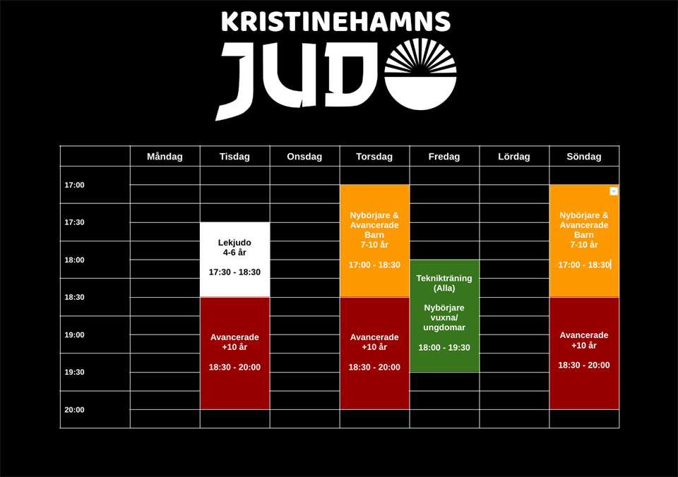 Nu är det snart dags för terminstart i skolan vilket betyder att även judoträningen kör igång igen! Första träningen kör igång nu tisdag i nästa vecka, den 16/8. På grund av ändrade arbetsförhållanden hos tränarna så har vi dock fått ändra om lite i träningsschemat. Se det nyutlagda schemat för information om detta! Nu på söndag den 14/8 kl 10:00 kommer vi ha ett informationsmöte med fika och sen lite städ av träningslokalen inför terminsstart, detta hålls i källaren på klubben. Vi hoppas att så många som möjligt kan komma på detta! Inbjudan skickas separat. Vänliga hälsningar Styrelsen Kristinehamns Judoklubb 11 aug 2022 0kommentarer