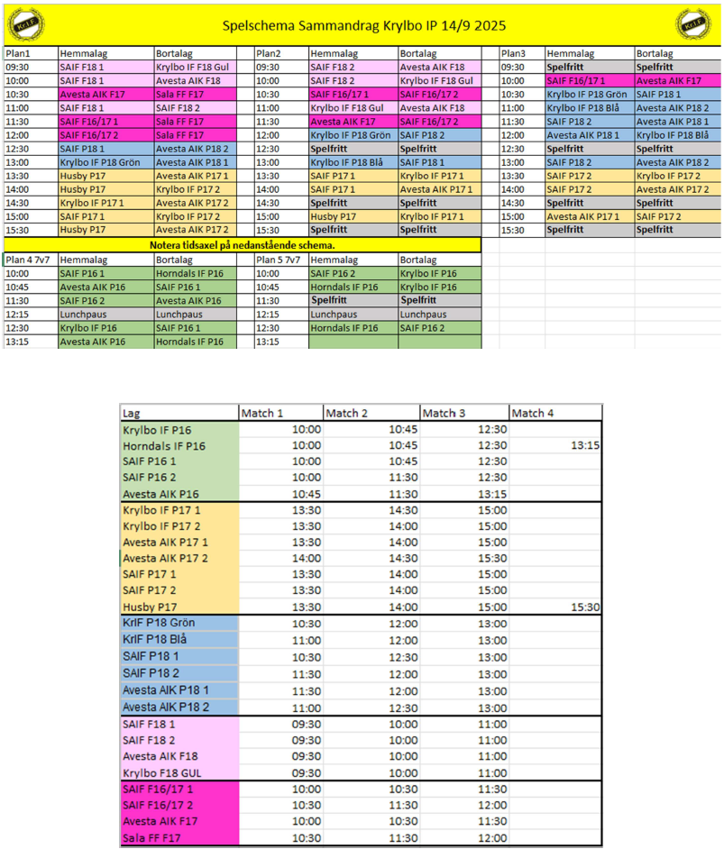 God morgon, Här nedan följer info om sammandraget på Krylbo IP som äger rum på söndag 14/9. Som vanligt gäller följande: -Ta med shorts (gärna svarta), benskydd, strumpor och vattenflaska. -Samling utanför Kiosken ombytta och klara 15min innan första matchstart. -Matchtröja får man på plats, tröjan lämnas tillbaka direkt efter sista matchen. -Endast de anmälda enligt laguttagning nedan ska spela på sammandraget. -Kan man inte komma så MÅSTE man så snart som möjligt informera någon av oss ledare att man inte kan. Vi är väldigt lite folk i varje lag så fungerar inte detta så kommer vi få stora problem. Krylbo IF P17 1, gul på schema. Tränare Tom, Samling 13:15. Matcher: 13:30 P2, 14:30 P1, 15:00 P2. Alfred Christian M Mason Neymar Optimus Oskar William Krylbo IF P17 2, gul på schema Tränare Jonas, Samling 13:15. Matcher: 13:30 P3, 14:00 P1, 15:00 P1. Hasan Ryan Caspian Christian H Oliver Melvin P Ali Krylbo IF P16, grön på schema. Tränare Nils, Samling 09:45. Matcher: 10:00 P5, 10:45 P5, 12:30 P4. Alex August Axel Benjamin Daniel Maurice Melvin B Mirav Natu Neo Noel Sem Yasser Vi hoppas på en toppendag på Krylbo IP. Med vänlig hälsning, Ledarna.