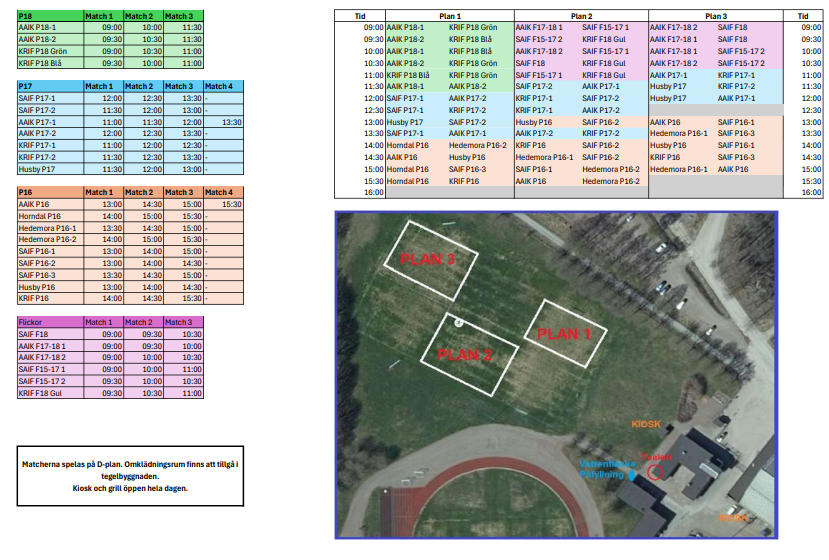 Här nedan följer info om sammandraget i Avesta som äger rum på lördag 30/8. Som vanligt gäller följande: -Ta med shorts (gärna svarta), benskydd, strumpor och vattenflaska. -Samling utanför Kiosken ombytta och klara 15min innan första matchstart. -Matchtröja får man på plats, tröjan lämnas tillbaka direkt efter sista matchen. -Endast de anmälda enligt laguttagning nedan ska spela på sammandraget. -Kan man inte komma så MÅSTE man så snart som möjligt informera någon av oss ledare att man inte kan. Vi är väldigt lite folk i varje lag så fungerar inte detta så kommer vi få stora problem. Krylbo IF P17 1, Blå på schema. Tränare Jonas, Samling 10:45. Matcher: 11:00 P3, 12:00 P2, 12:30 P2 Caspian Christian H Dante Melvin P Oliver Oskar Ryan Krylbo IF P17 2, Blå på schema. Tränare Tom, Samling 11.15. Matcher: 11:30 P3, 12:30 P1, 13:30 P2 Hasan Mason William Christian M Alfred Optimus Peter Krylbo IF P16, Orange på schema. Tränare Nils, Samling 13:45. Matcher: 14:00 P2, 14:30 P3, 15:30 P1. Alex Axel Benjamin Daniel Maurice Melvin B Mirav Neo Noel Sem Yasser Hoppas på en grym fotbollsdag. Med vänlig hälsning, Ledarna