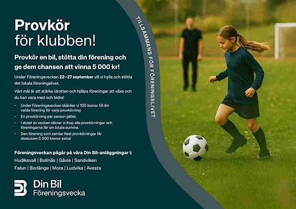 Nästa vecka är det föreningsvecka hos Din Bil i Avesta. För varje provkörning där man anger Krylbo IF som sin förening så får föreningen 100kr. Samlar vi flest provkörningar så får även föreningen en bonus på 5000kr. Passa på att provköra din drömbil och samtidigt stötta föreningen. 💛
