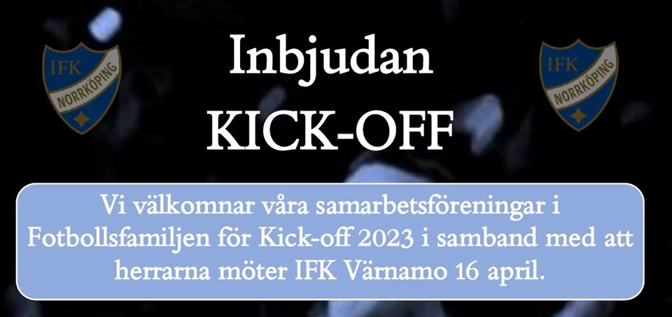 Den 16 april har vi bjudits in av IFK Norrköping till Kick Off för fotbollsfamiljen Vi har totalt 10 platser och de som anmält sig till att delta på IFKs tränarutbildning är 3 av dessa (Simon Fornemyr, Fernando Arana och Jimmy Eriksson). Finns det ytterligare intresserade som vill delta på "bara" kick offen och inte resten av utbildningsträffarna så kommentera nedan senast söndag 2 april. Upplägget för kickoffen 16 april 11.00 Information Fotbollsfamiljen, Utbildning Utvecklingsmiljö samt lunch 15.00 Matchstart IFK Norrköping - IFK Värnamo 17.00 Slut å hemresa