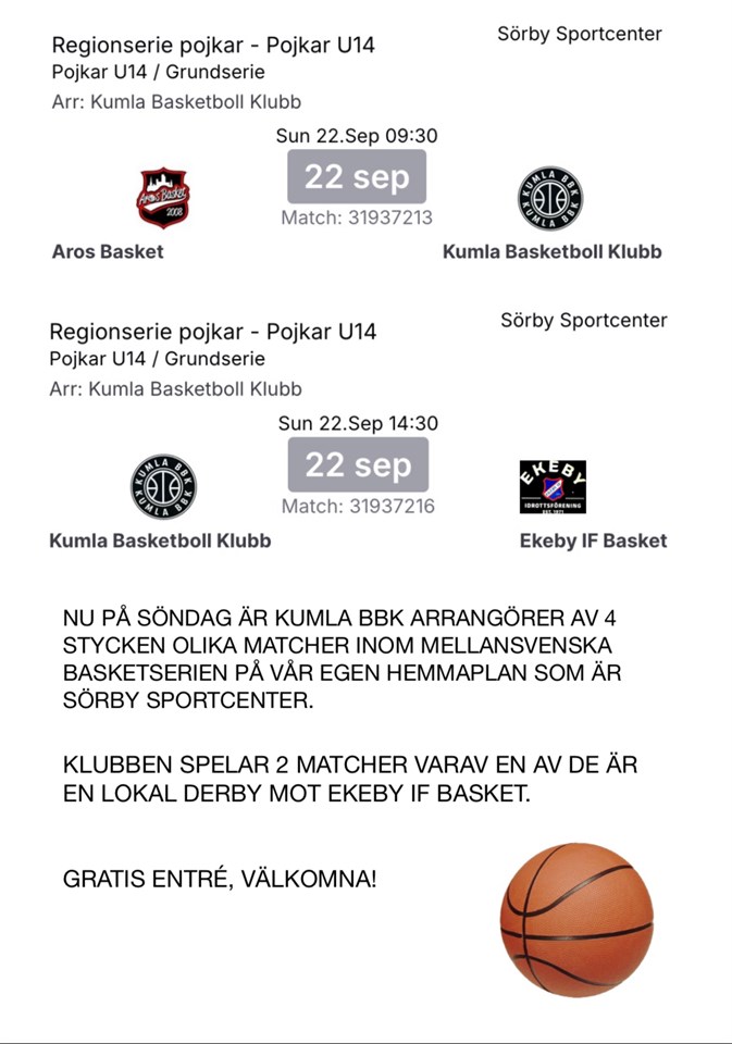 Hej! Ni har träning som vanligt direkt efter de 4 matcher som spelas i mellansvenska nu på söndag. Schema för våra U14 matcher finns i den bifogade filen. Hoppas ni har möjlighet att heja fram Kumla BBK! Mvh Ben U9 19 sep 2024 0kommentarer