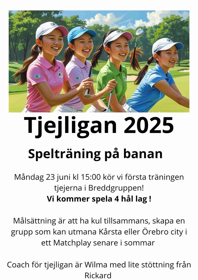 Nu är det dags för tjejligans första träning Alla tjejer med grönt kort I Breddgruppen är välkomna Nu på Måndag 23 juni 15:00 samlas vi Vid puttninggreen sen går vi ut på banan och spelar 4 hål i två lag Anmäl dig med ett Sms till Rickard på 0706287671 Breddgruppen 20 jun 0kommentarer