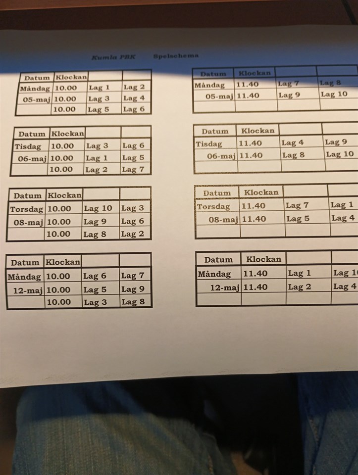 Kumla PBK Spelschema Datum Klockan Datum Klockan Måndag 10.00 Lag 1 Lag 2 Måndag 11.40 Lag 7 Lag 8 05-maj 10.00 Lag 3 Lag 4 05-maj 11.40 Lag 9 Lag 10 10.00 Lag 5 Lag 6 Datum Klockan Datum Klockan Tisdag 10.00 Lag 3 Lag 6 Tisdag 11.40 Lag 4 Lag 9 06-maj 10.00 Lag 1 Lag 5 06-maj 11.40 Lag 8 Lag 10 10.00 Lag 2 Lag 7 Datum Klockan Datum Klockan Torsdag 10.00 Lag 10 Lag 3 Torsdag 11.40 Lag 7 Lag 1 08-maj 10.00 Lag 9 Lag 6 08-maj 11.40 Lag 5 Lag 4 10.00 Lag 8 Lag 2 Datum Klockan Datum Klockan Måndag 10.00 Lag 6 Lag 7 Måndag 11.40 Lag 1 Lag 10 12-maj 10.00 Lag 5 Lag 9 12-maj 11.40 Lag 2 Lag 4 10.00 Lag 3 Lag 8 Lycka till Tävlingskommitten Kumla PBK 25 apr 1kommentar