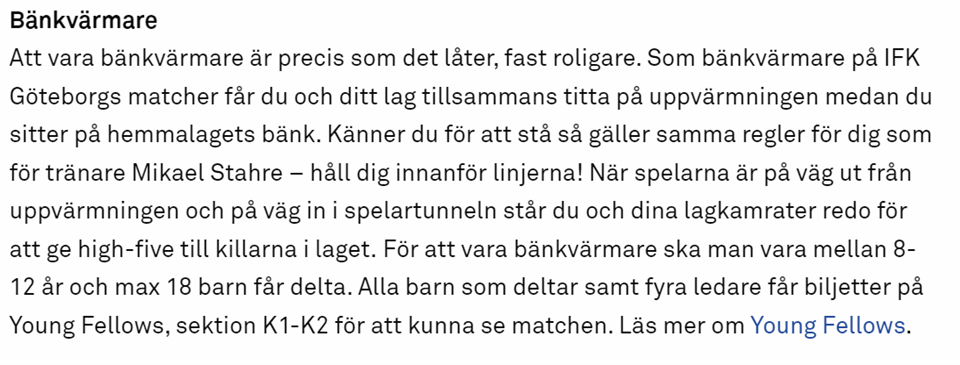 Hej, vi har nu glädjen att meddela att vi har blivit utvalda av IFK Göteborg att iår få möjligheten med tjejerna att agera ``Bänkvärmare´´ som det heter på en av deras matcher. Matchen vi fick är IFK - Hammarby söndagen den 21/5. Skall bli väldigt kul att få göra detta tillsammans med tjejerna på ett förhoppningsvis fullsatt Ullevi. IFK Göteborg har en maxgräns på 18deltagare & 4ledare. Vi kommer därför redan nu skicka ut en förfrågan för att få en indikation på vilka som kan & vill vara med på detta. Vi kommer ifall vi blir för många tjejer vara tvungna att ge de tjejer som har tränat under försäsongen förtur. Men detta får vi återkomma med ifall så blir fallet. Men som sagt, kul att vi blivit utvalda till detta och vi tror verkligen detta kan bli en rolig upplevelse för tjejerna att vara med om.