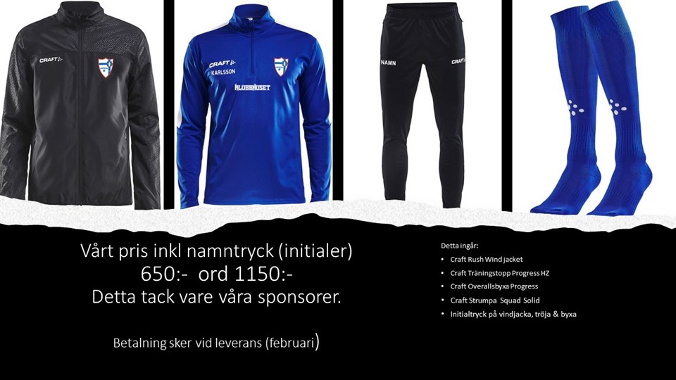 Hej på er, Som ni vet så har vi provat ut vindjacka, tröja och byxa till killarna. Tack vare våra sponsorer så har vi fått ner priset ordentligt. Ordinarie pris inkl namntryck 1150: Ni betalar 650:- för allt se bifogad fil! Jag kommer skicka ut en kallelse under dagen. Om ni vill beställa kläderna så klickar ni i rutan "kommer". Om ni inte vill beställa kläderna klickar ni i rutan "kommer inte" .Anmälan är bindande, men betalning sker vid leverans, förmodligen mitten på februari. Ni ser i bifogad fil vad som ingår! Har ni INTE provat än så finns jag i klubbhuset nu på torsdag (14/1) mellan 18:15 - 18:45, meddela mig om ni vill prova (Magnus 0731-512215). Mvh Tränarna U15-U16 12 jan 2021 0kommentarer